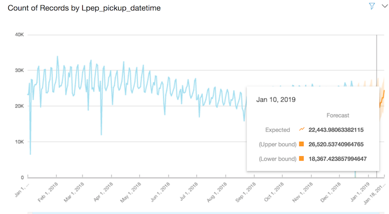 You now see an orange line on your graph, which is the forecasted pickup quantity per day for the next 31 days after December 18, 2018. You can explore the different dates by hovering your cursor over different points on the forecasted pickup line. For example, hovering your cursor over January 10, 2019, shows that the expected forecasted number of pickups for that day is approximately 22,000. The forecast also provides an upper bound (maximum number of pickups forecasted) of about 26,000 and a lower bound (minimum number of pickups forecasted) of about 18,000.