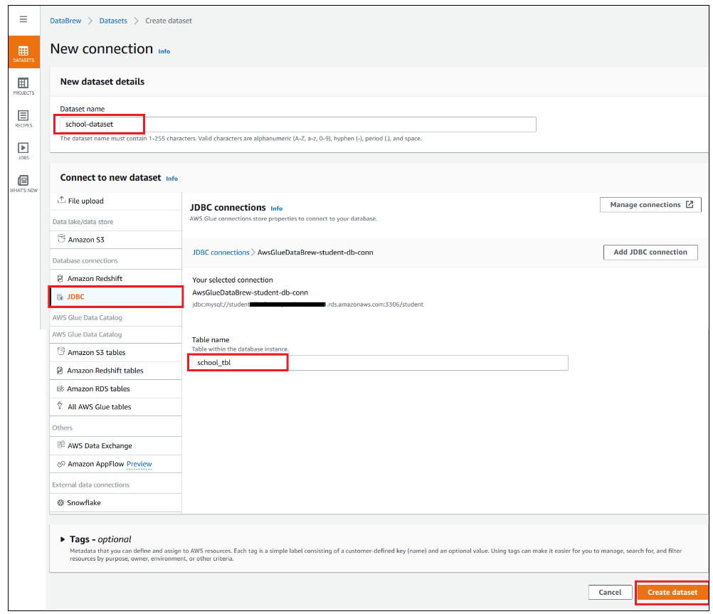 school_tbl. - Choose Create dataset.