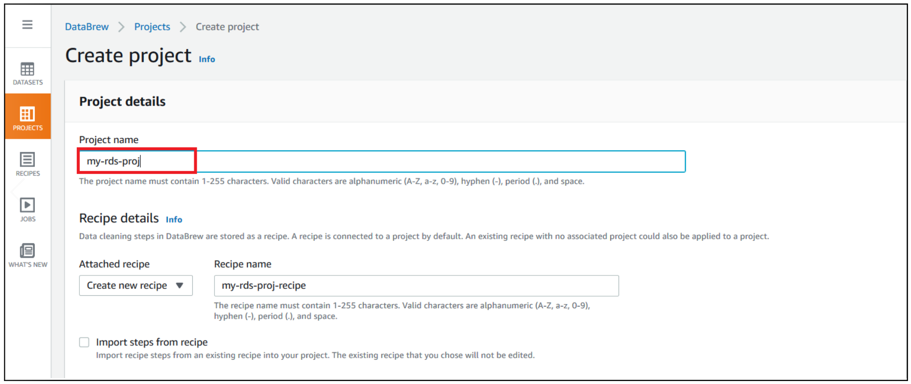 my-rds-projand its associated recipemy-rds-proj-recipe - The DataBrew datasets
