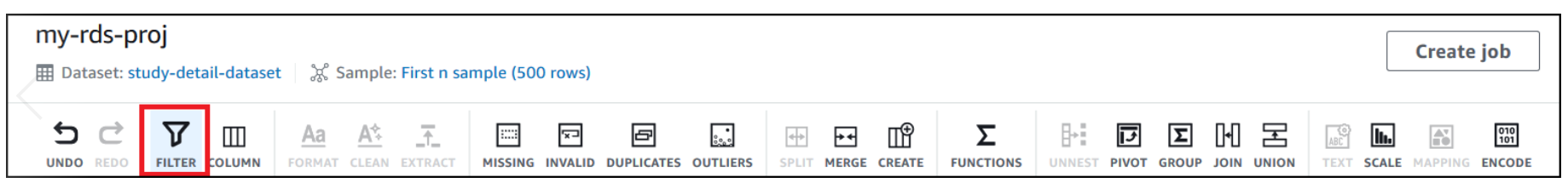 Open an Amazon RDS project and build a transformation recipe