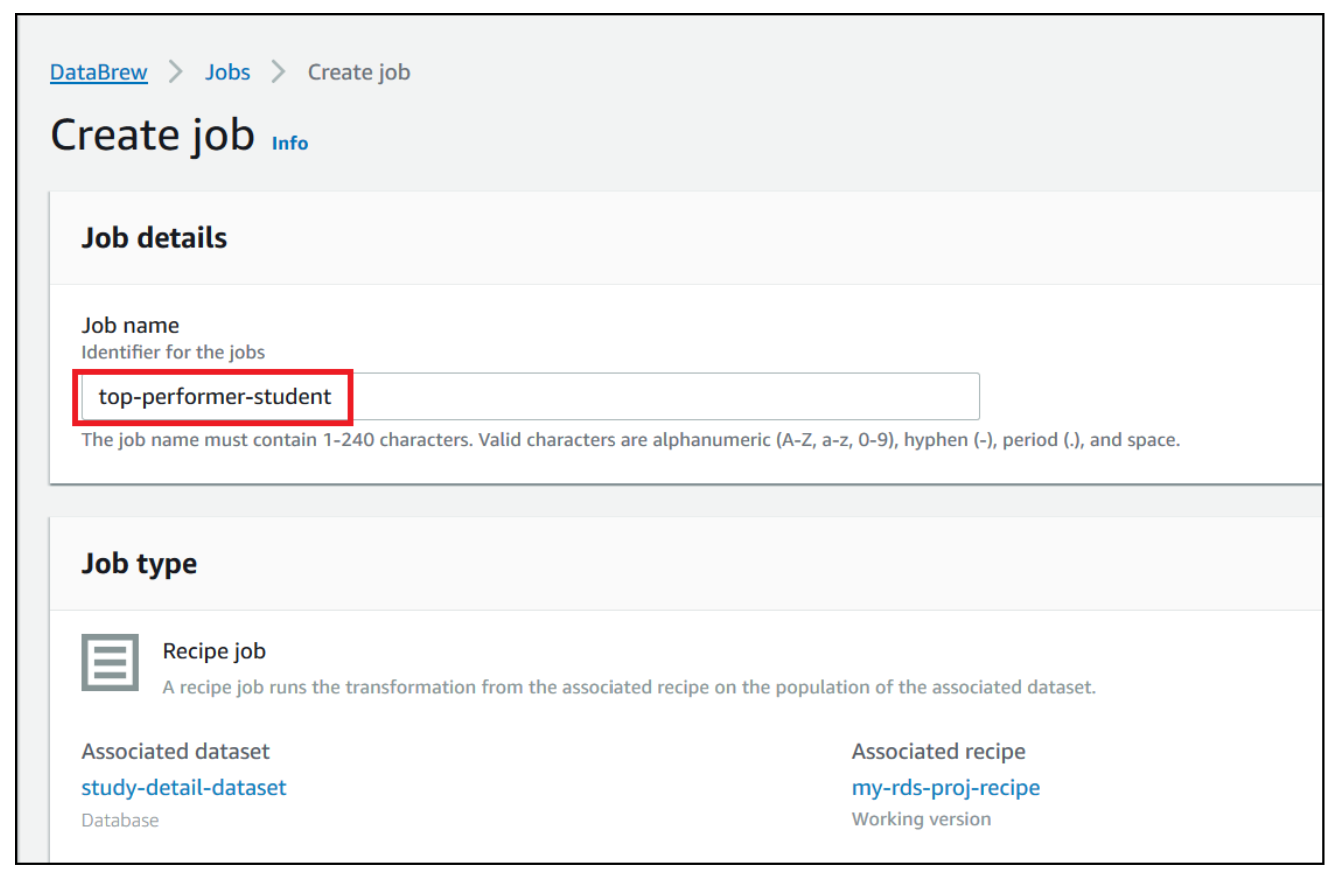 - Create a JDBC connection for RDS and a DataBrew project. DataBrew does the transformation to find the top performing students across all the schools considered for analysis.