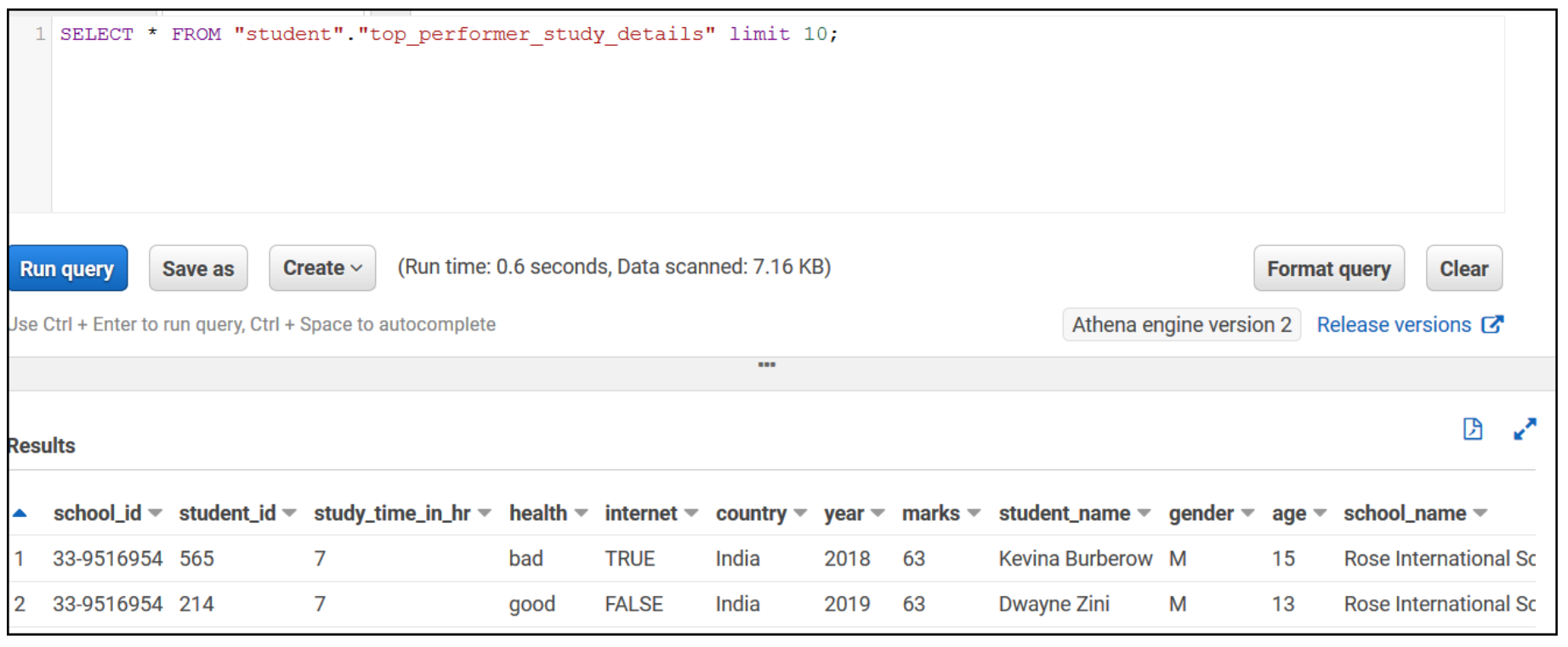 Let’s validate the aggregated table output in Athena by running a simple SELECT query. The following screenshot shows the output.
