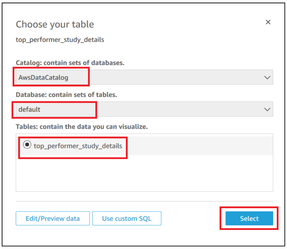 - Choose the database and catalog you have in Athena.