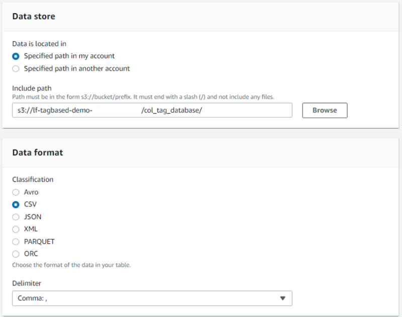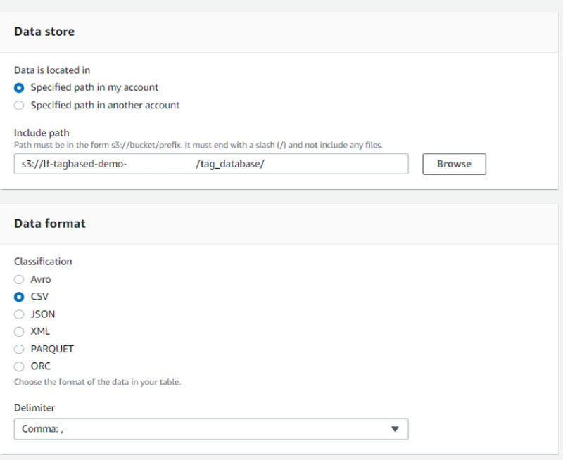 col_tag_database(s3://lf-tagbased-demo-<<Account-ID>>/col_tag_database/). - For Data format, select CSV.