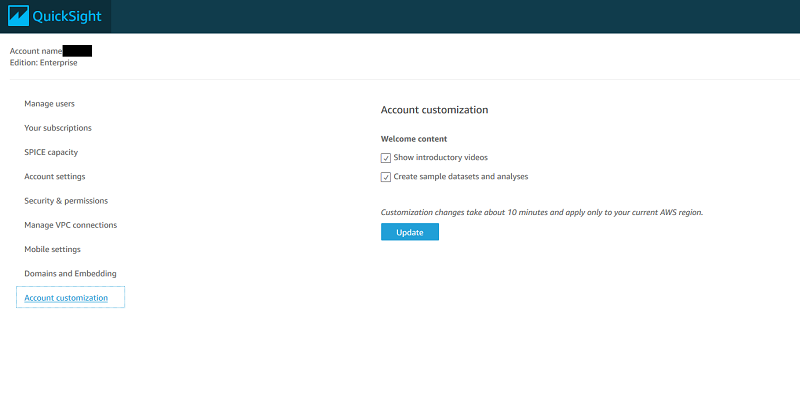 First, we turn off the instructional videos and samples in QuickSight, because Oktank has its own product welcome videos and wants to include QuickSight onboarding in those. QuickSight admins can access this on the Account customization page.