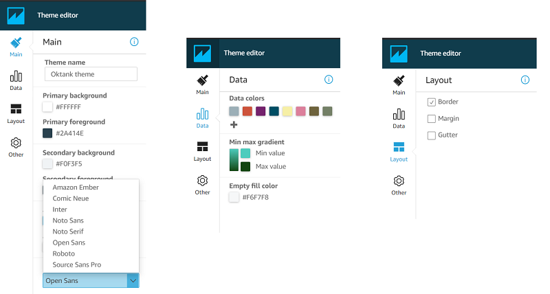 Before we start with the embedded authoring flow, we can set up a default theme for authors in the Foo namespace. The theme editor in QuickSight allows you to change the colors, fonts, and layouts that are used in a dashboard.
