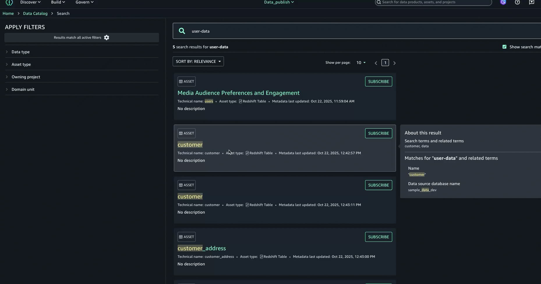 Enhanced search transparency in Amazon SageMaker Unified Studio transforms data discovery by providing clear visibility into why assets appear in search results. The inline highlighting and detailed match explanations help users quickly identify relevant datasets while building trust in the data catalog. By showing exactly which metadata fields matched their queries, users spend less time evaluating irrelevant assets and more time analyzing the right data for their projects.