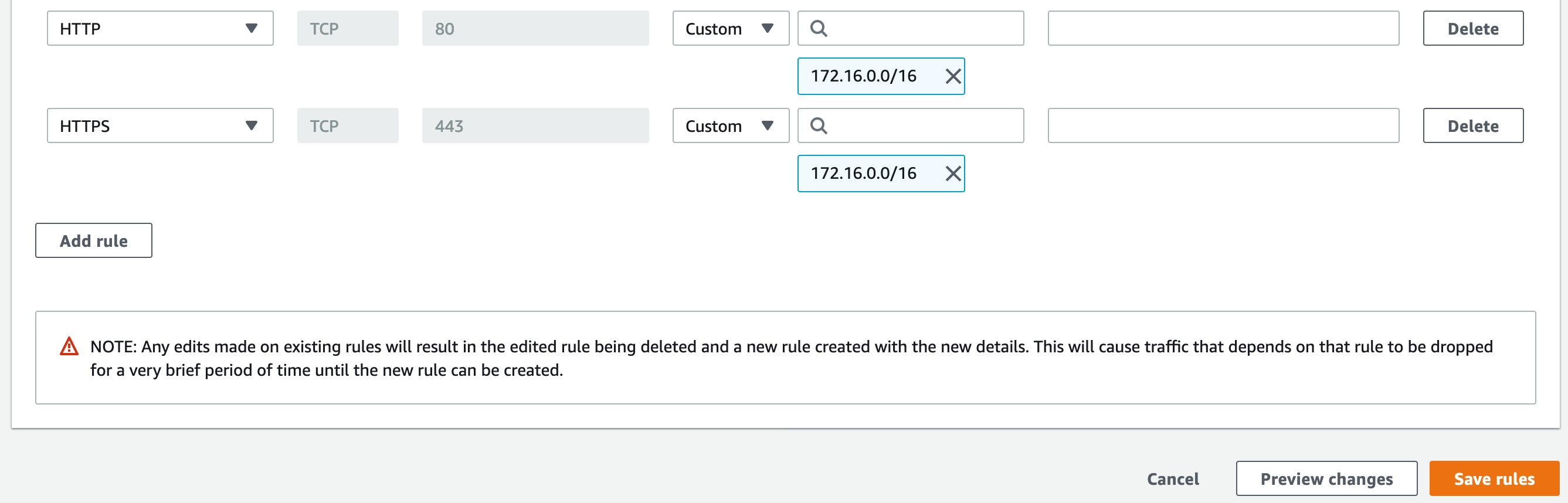 - Add rules for both HTTPS and HTTP, using the CIDR Block for the VPC in Region B as the source (for this post, 172.16.0.0/16).
