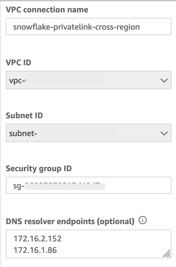 quicksight-inbound-resolver). - For VPC in the Region, choose the VPC ID used in previous steps.