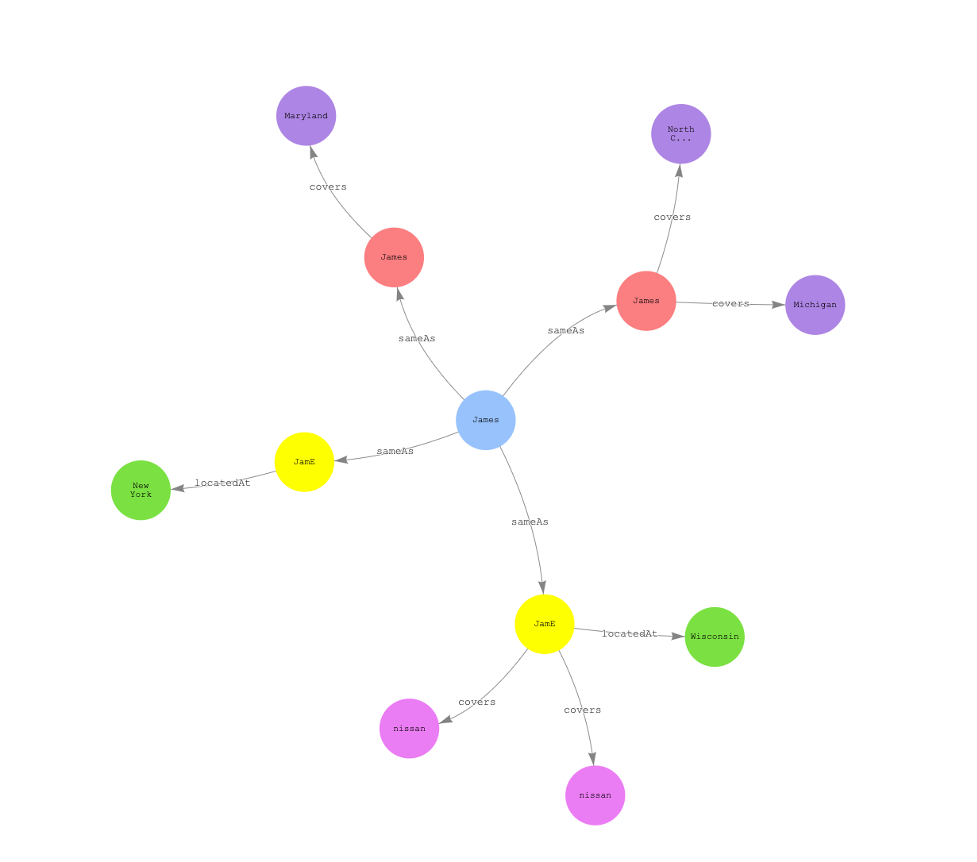 These are all records for the same customer, but because they’re not linked in any way, they appear as different customer records. The AWS Glue FindMatches ML transform job will identify these records as customer James, and the records provide complete visibility on all policies owned by James. The Neptune graph looks like the following example. The vertex covers represents the coverage of auto or property insurance by the owner (James in this case) and the vertex locatedAt represents the address of the property or vehicle that is covered by the owner’s insurance.