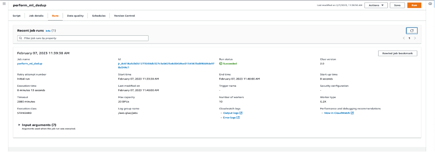 - Run the AWS Glue ML transform job. The job also catalogs the harmonized data in the Data Catalog and transforms the harmonized insurance data into CSV format acceptable to Neptune Bulk Loader.