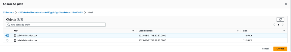 labelin your S3 bucket, select the labeled file (Label-1-iteration.csv), and choose Choose. And Click “Upload labeling file from S3”.