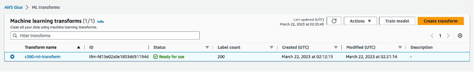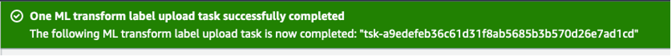Before proceeding to the next steps, note the transform ID (tfm-xxxxxxx) for the created ML transform.
