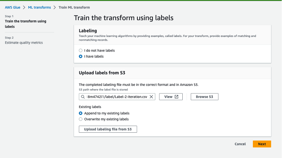 Label-2-iteration.csv) and select Append to my existing labels. - Wait for the successful upload, then choose Next.
