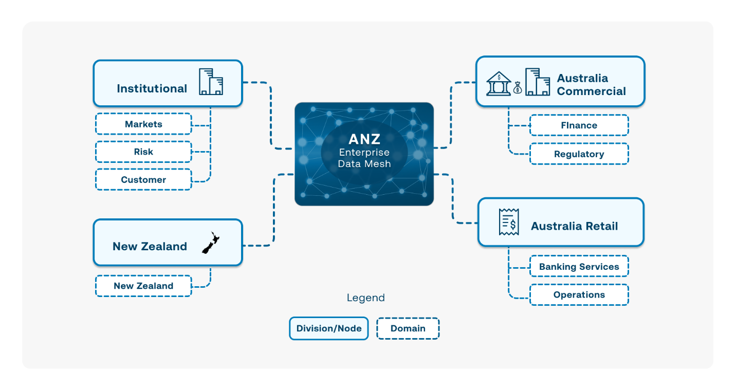 Within the ANZ enterprise data mesh strategy, aligning data mesh nodes with the ANZ Group’s divisional structure provides optimal alignment between data mesh principles and organizational structure, as shown in the following diagram.