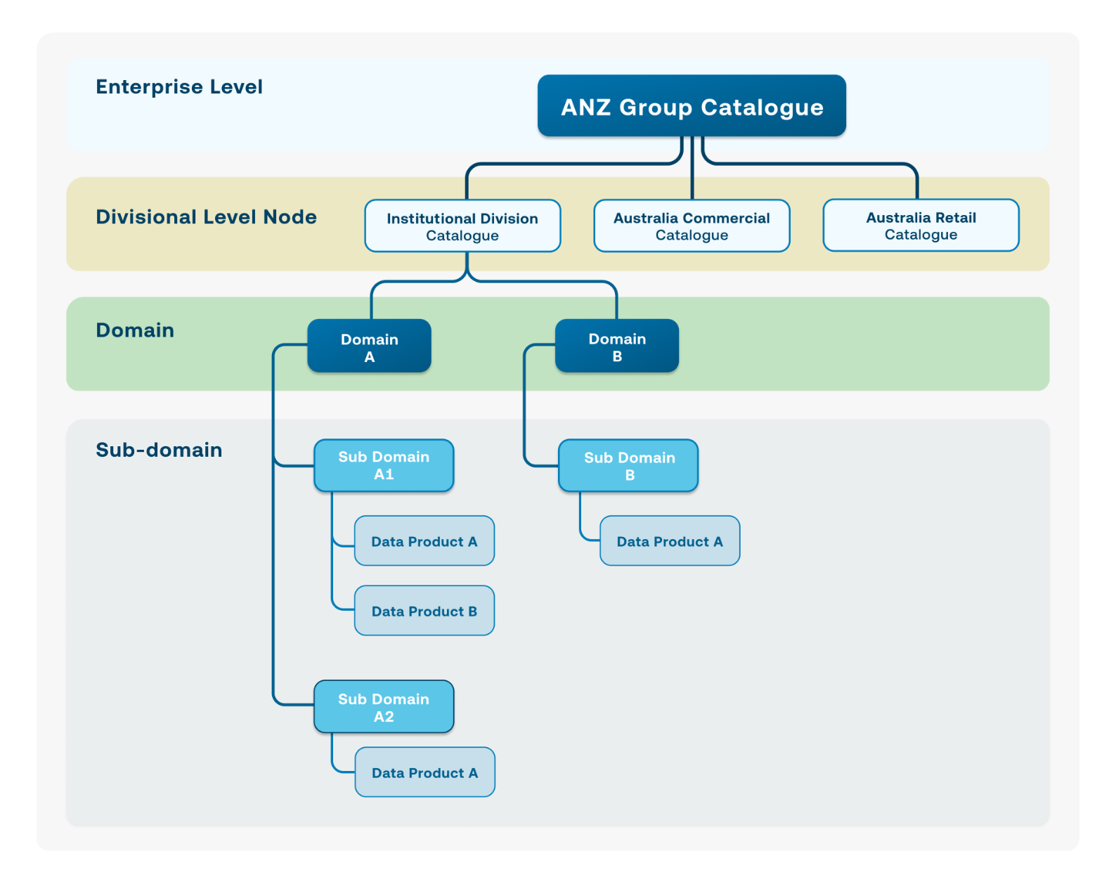 As a result, governance resides with the data products themselves, making sure standards and policies, such as access control, data quality, and compliance, are enforced where the data lives. In this regard, the enterprise data product catalog acts as a federated portal, facilitating cross-domain access and interoperability while maintaining alignment with governance principles. This model balances node or domain-level autonomy with enterprise-level oversight, creating a scalable and consistent framework across ANZ.