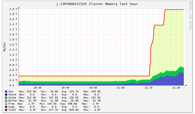 After we applied improvements around join operation and cache strategies in Spark application development, we realized that some of those applications were assigned with overestimated resources in the EMR cluster. That means Spark applications assigned resources, but only 30% of the resources were used. The following Ganglia report illustrates the overestimation of resource allocation for one Spark application job, which we captured during one of our tests.