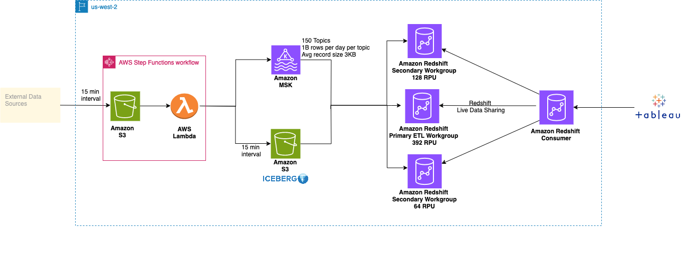 - Secondary Redshift Serverless workgroups – Additional producer workgroups of varying sizes to distribute and scale near real-time data ingestion from over 150 MSK topics based on price-performance requirements