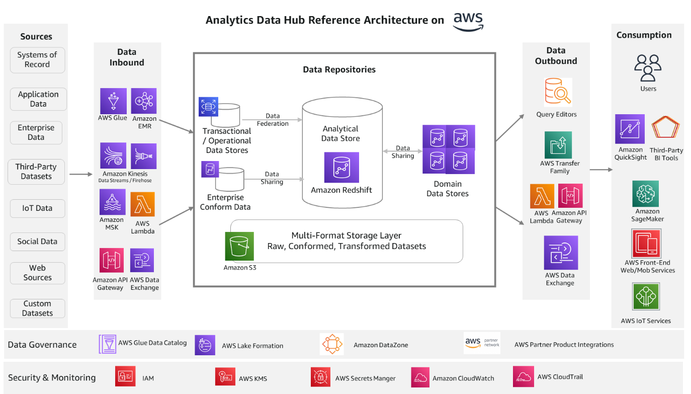 This section consists of a group of data stores, which includes data warehouses, transactional or operational data stores, reference data stores, domain data stores housing purpose-built business views, and enterprise datasets (file storage). The file storage component is usually a common component between a data hub and a data lake to avoid data duplication and provide comprehensiveness. Data can also be shared among all these repositories without physically moving with features, such as data sharing and federated queries. However, data copy and duplication are allowed considering various consumption needs in terms of formats and latency.