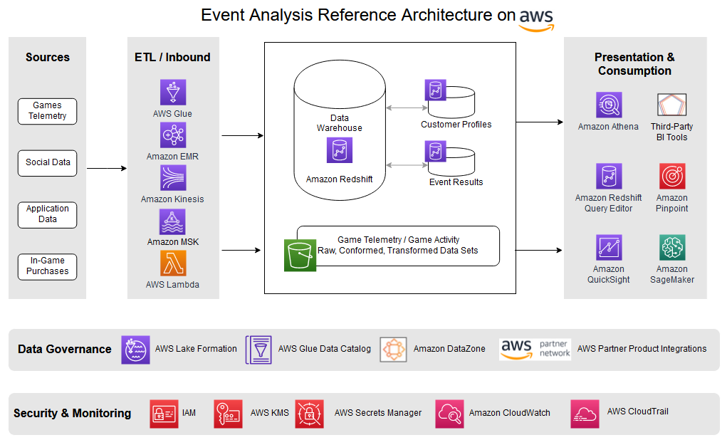 This reference architecture, while showing examples of only a few analysis types, provides a faster technology path for enabling game analytics applications. The decoupled, hub/spoke approach brings the agility and flexibility to implement different approaches to analytics and understanding the performance of game applications. The purpose-built AWS services described in this architecture provide comprehensive capabilities to easily collect, store, measure, analyze, and report game and event metrics. This helps you efficiently perform in-game analytics, event analysis, measure player satisfaction, and provide tailor-made recommendations to game players, efficiently organize events, and increase retention rates.