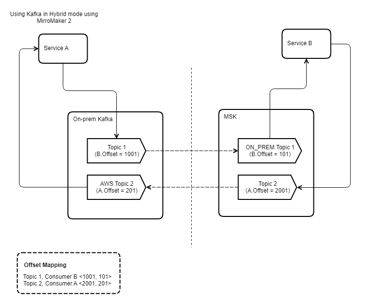 This way, after Service B is switched from on-premises Apache Kafka to Amazon MSK, it starts consuming from the correct offset and maintains the at-least-once message consumption guarantee. A model like this allows an incremental migration of applications without a period of significant downtime.