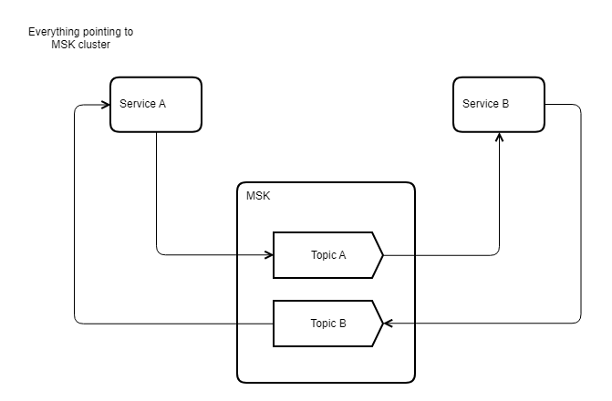Let’s go into the specifics of how GIR implemented a proof of concept for Option 2 with an example. For their evaluation, GIR had two services, Service A and Service B, pointing to the on-premises Apache Kafka cluster. Both services were producing to and consuming from different topics, as shown in the following diagram.