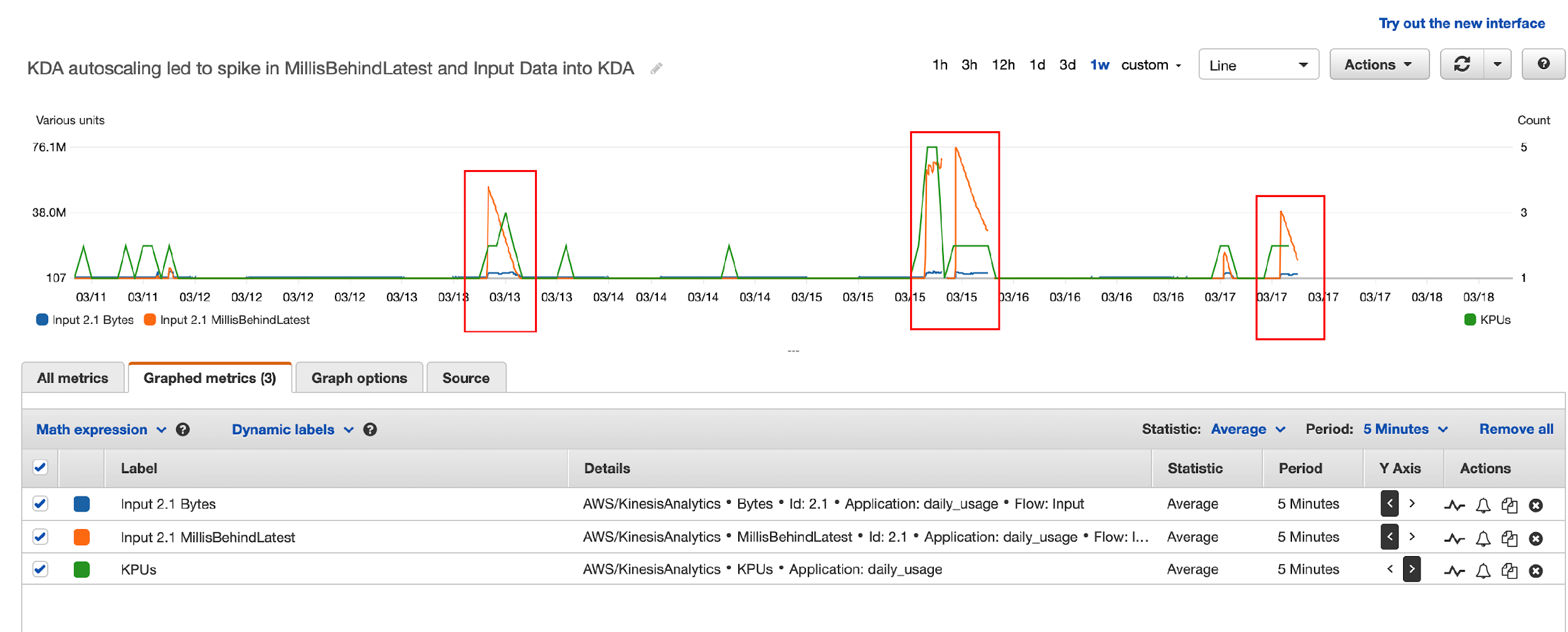 However, they started to receive “read limit exceeded” alerts from the source data stream, and the legacy application was read throttled. With Amazon Support’s help, they traced the issues to the drastic reversal of the Kinesis Data Analytics MillisBehindLatest metric in Kinesis record processing. This was correlated to the Kinesis Data Analytics auto scaling events and application restarts, as illustrated by the following diagram. The highlighted areas show the correlation between spikes due to autoscaling and reversal of MillisBehindLatest metrics.