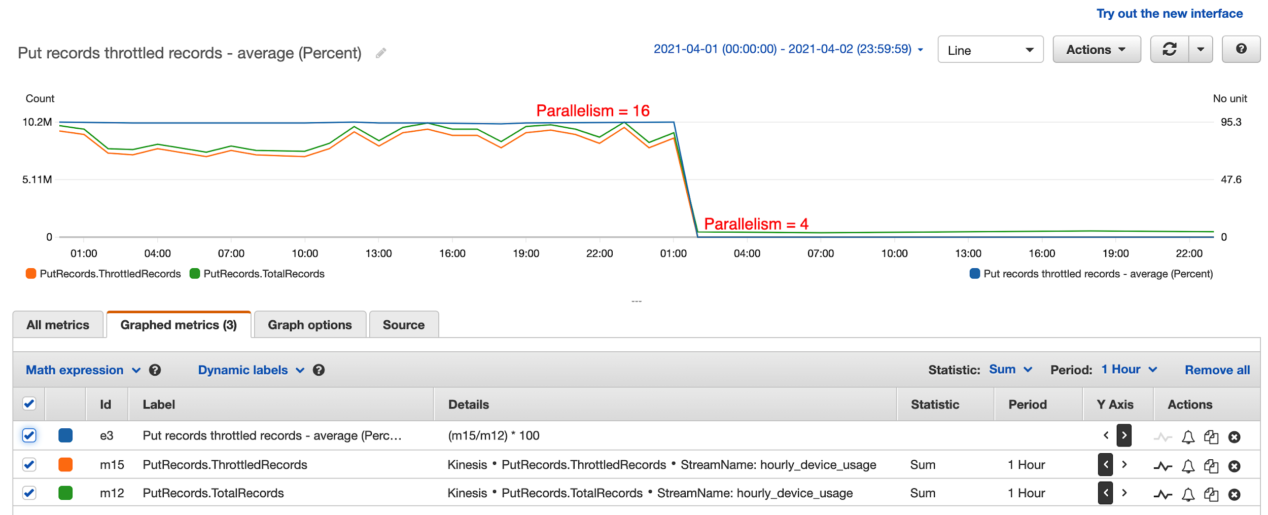 The solution was to reduce parallelism to 4 and disable auto scaling. In the preceding diagram, the percentage of throttled records dropped to 0 from 95% after they reduced parallelism to 4 in the Kinesis Data Analytics application. This also greatly improved KPU utilization and reduced Kinesis Data Analytics cost from $50 a day to $8 a day.