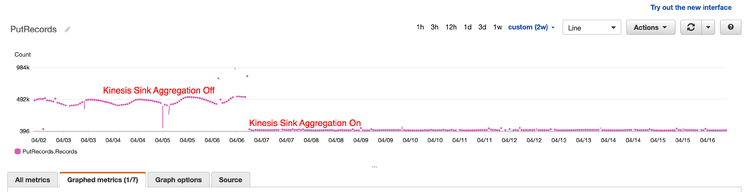 After tuning parallelism, they still noticed occasional throttling by Kinesis Data Streams because of the number of records being written, not record size. To overcome this, they turned on Kinesis Data Analytics sink aggregation to reduce the number of records being written to the data stream, and the result was dramatic. They were able to reduce the number of writes by 1,000 times.
