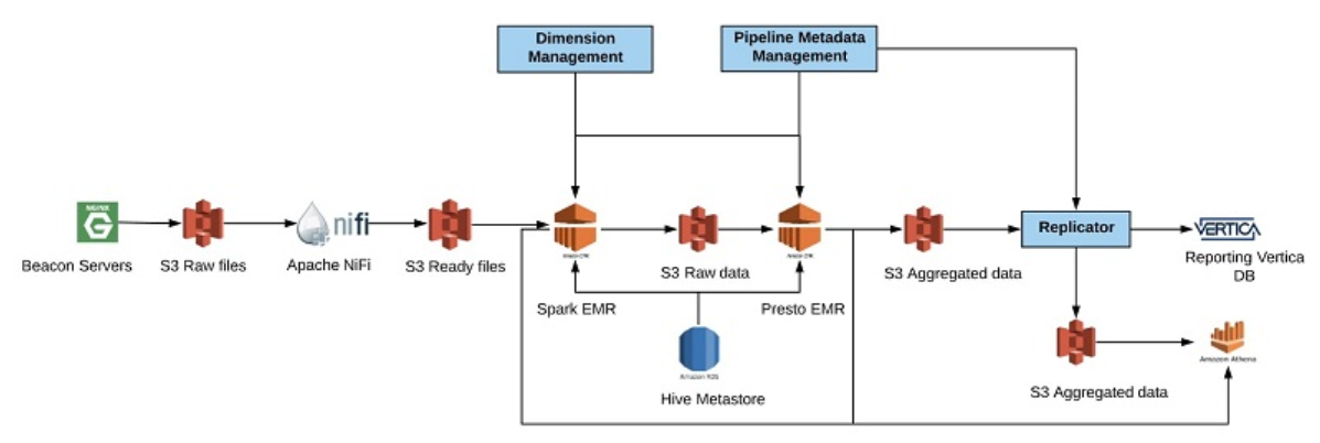 We start getting data on our NGINX beacon servers. The data is stored in 1-minute intervals on local disk in gzip files. Every minute, we move the data from NGINX servers to raw data location in S3. Upon landing on S3, the file sends a message to Amazon SQS. Apache NiFi is listening to SQS messages to start working on files. During this time, NiFi groups smaller files into larger files and stores the outcome in a special path on a temporary location on S3. The path name is combined using an inverse timestamp to make sure we store data in a random location to avoid reading bottlenecks.