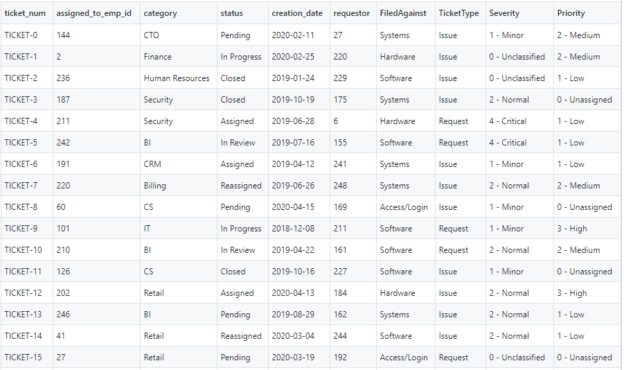 Our randomly generated sample ticketing dataset has about 250 tickets (see the following screenshot). Each of these tickets is assigned to an employee. The column assigned_to_emp_id represents the employee that the ticket is assigned to. The code to generate a random sample of the data is available on the GitHub repo.