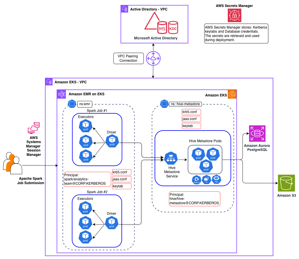 Many organizations run their Apache Spark analytics platforms on Amazon EMR on Amazon Elastic Compute Cloud (Amazon EC2), using Kerberos authentication to secure connectivity between Spark jobs and a centralized shared Apache Hive Metastore (HMS). With Amazon EMR on Amazon EKS, they gained a new option for running Spark jobs with the benefits of Kubernetes-based container orchestration, improved resource utilization, and faster job startup times. However, an HMS deployment supports only one authentication mechanism at a time. This means that they must configure Kerberos authentication for their Spark jobs on Amazon EMR on EKS to connect to the existing Kerberos-enabled HMS.
