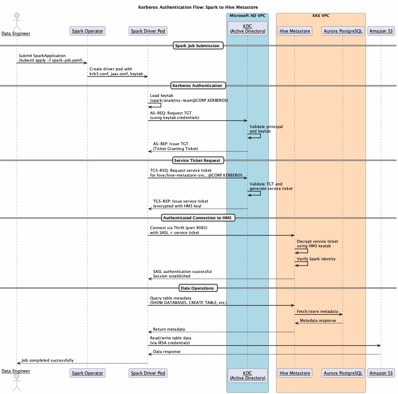 Apache Spark jobs are deployed using the Spark Operator on EKS. The Spark driver and executor pods are configured with Kerberos credentials through mounted ConfigMaps containing krb5.conf and jaas.conf, along with keytab files from Kubernetes secrets. When a Spark job must access Hive tables, the driver authenticates with the KDC and establishes a secure Simple Authentication and Security Layer (SASL) connection to the HMS.