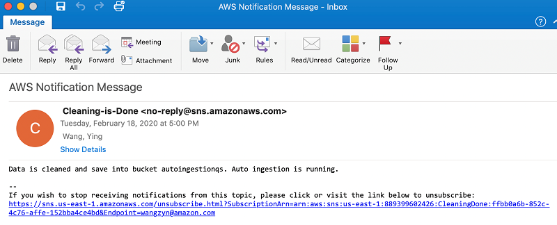 When the Lambda function ends, it triggers the SNS message Cleaning-is-Done. The following screenshot shows the text of the notification message.