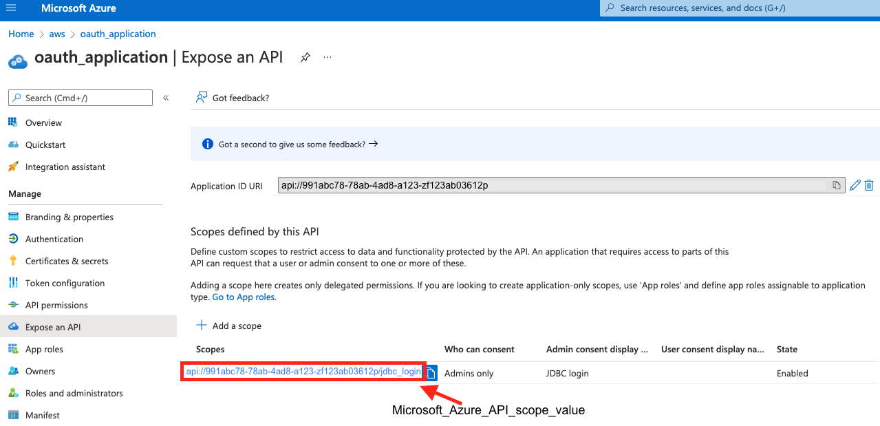api://991abc78-78ab-4ad8-a123-zf123ab03612p) and API scope (api://991abc78-78ab-4ad8-a123-zf123ab03612p/jdbc_login) in order to register the IdP in Amazon Redshift later.