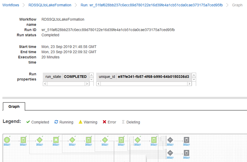 This step redirects you to the AWS Glue console, where you can dig deeper into each task of the workflow.