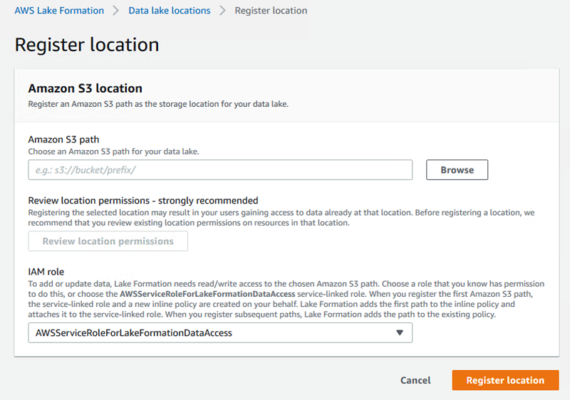 - Make sure that the S3 bucket you selected has the correct IAM permissions to work with Lake Formation.