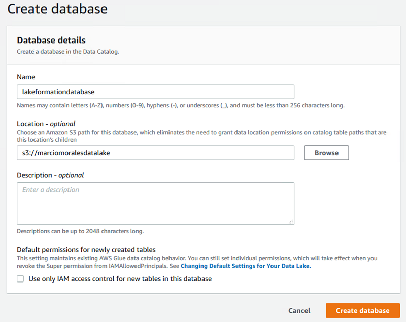 You are now ready to create a database to hold your data lake tables. Databases are logical and can be treated as namespaces. They are containers for the metadata tables that the AWS Glue Data Catalog stores. Databases can have an optional location property. This location needs to be within an Amazon S3 location that is registered with Lake Formation.