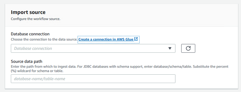 To ingest data to your data lake, you must define a database connection with parameters to allow AWS Glue to access the source database. - In the Import source section, for Database connection, choose Create a connection in AWS Glue.