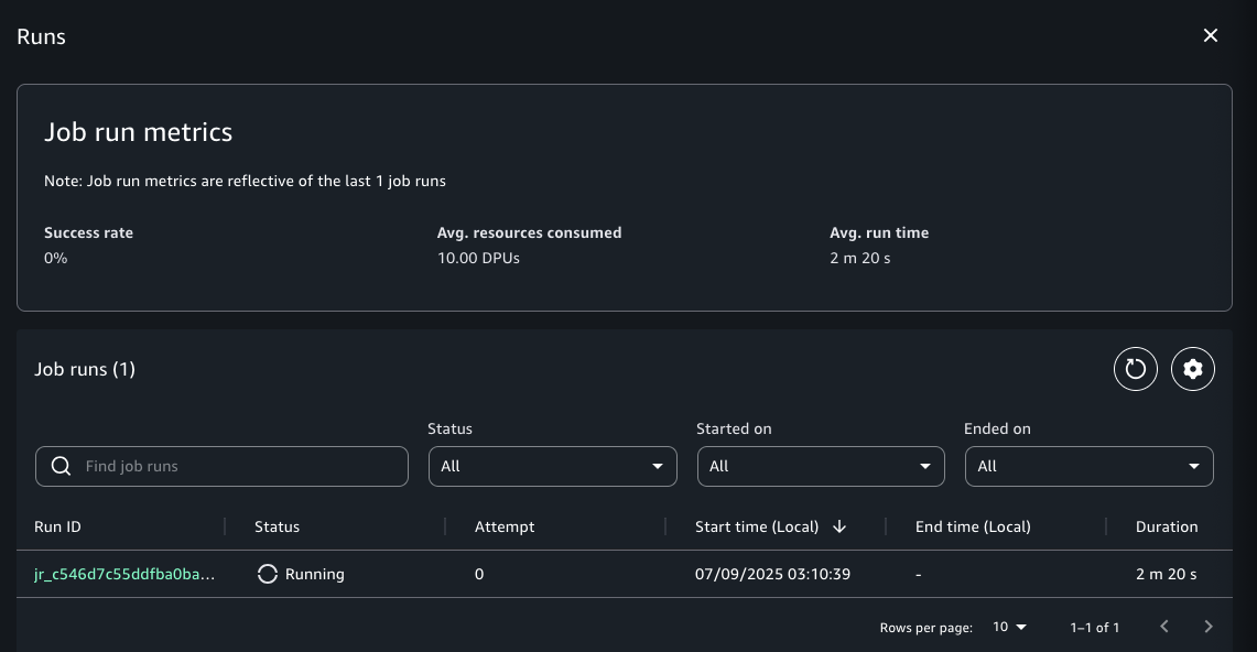 This will start running your Visual ETL job. You can monitor the list of job runs by selecting View runs in the top middle of the screen.