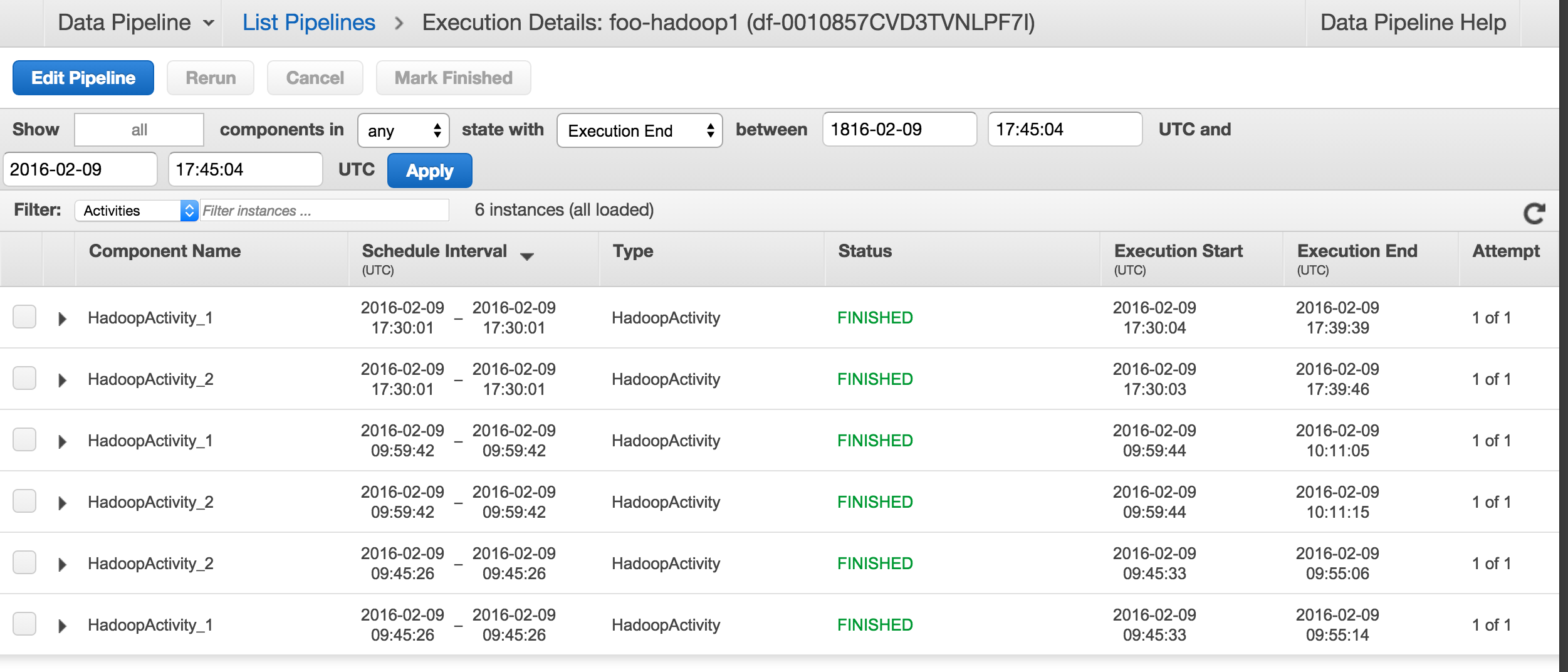 The screen shot below shows an on-demand pipeline with two Hadoop activities. The pipeline has been run three times.