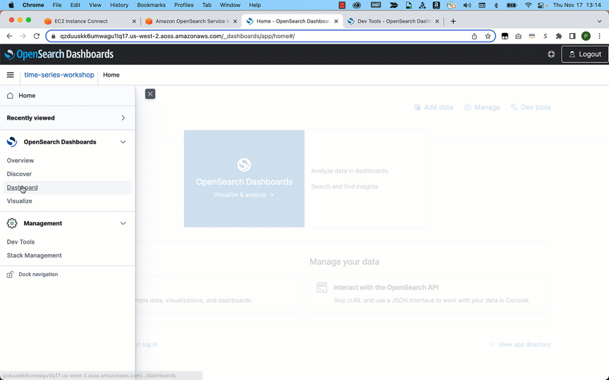 - On OpenSearch Dashboards, choose Dev Tools.