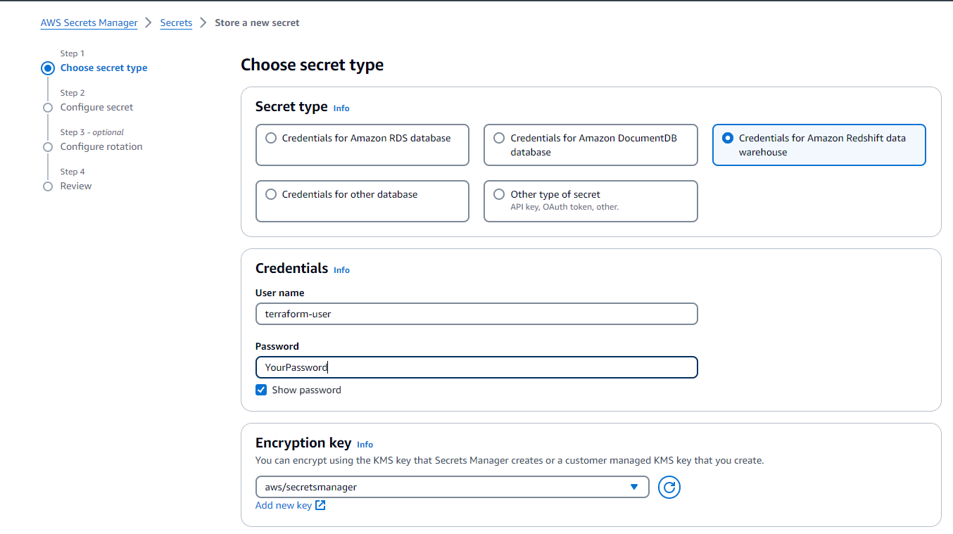 - For Secret type, select Credentials for Amazon Redshift data warehouse.