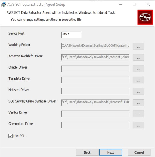 In the installation process, follow these steps to configure AWS SCT Data Extractor: