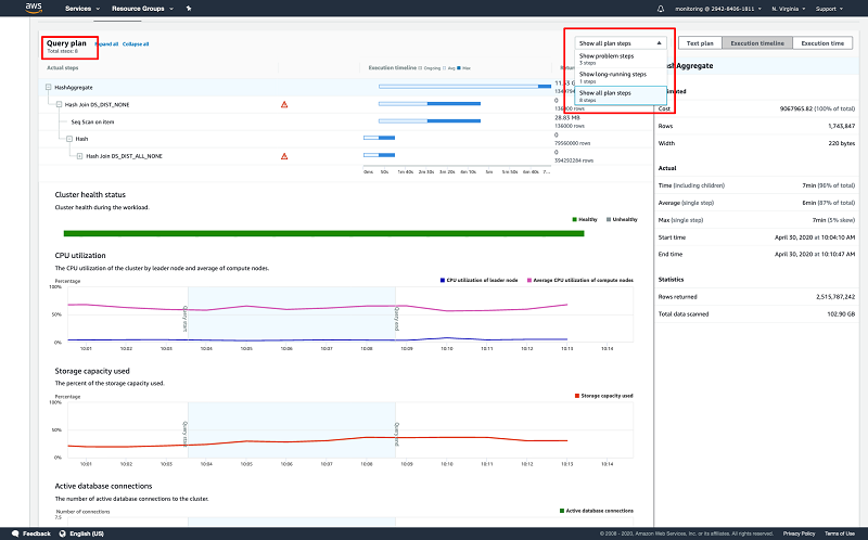 You can get a detailed view of your workload’s performance by looking at the Workload execution breakdown chart. You can find out how long it took to plan, wait, and execute your workload. You can also view time spent in operations such as INSERT, UPDATE, DELETE, COPY, UNLOAD, or CTAS. The chosen time in the query history is stored when you navigate between pages.