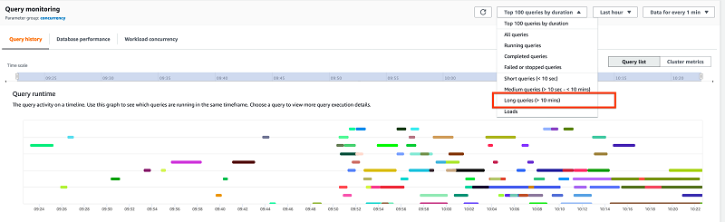 Amazon Redshift categorizes queries if a query or load runs more than 10 minutes. You can filter long-running queries by choosing Long queries from the drop-down menu. Similarly, you can also filter medium and short queries.