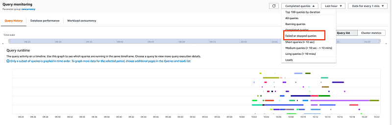 You can identify failed queries by choosing Failed or stopped queries from the drop-down menu on the Query monitoring page and then zooming in on the desired time.