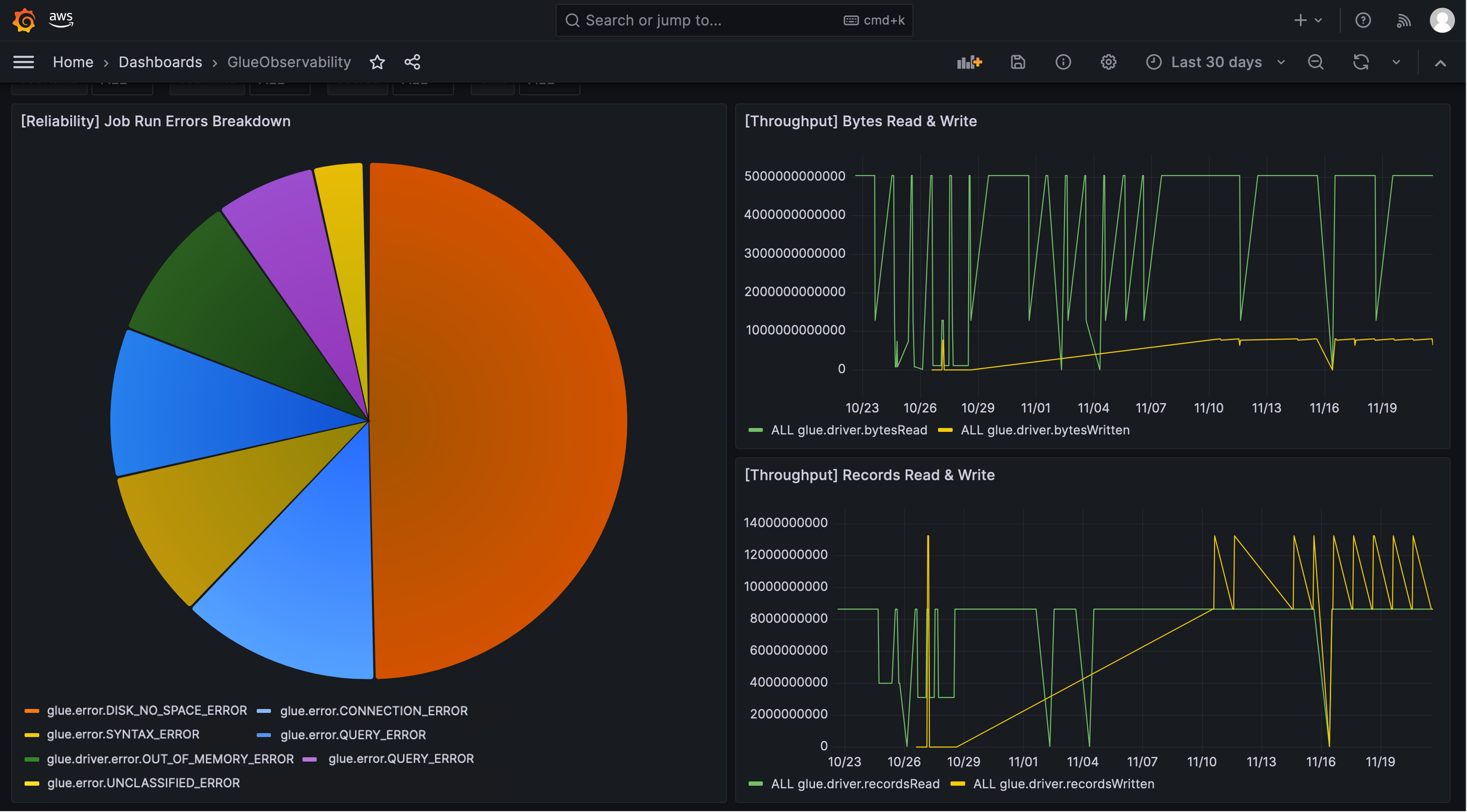 Monitoring data pipelines in real time is critical for catching issues early and minimizing disruptions. AWS Glue has made this more straightforward with the launch of AWS Glue job observability metrics, which provide valuable insights into your data integration pipelines built on AWS Glue. However, you might need to track key performance indicators across multiple jobs. In this case, a dashboard that can visualize the same metrics with the ability to drill down into individual issues is an effective solution to monitor at scale.