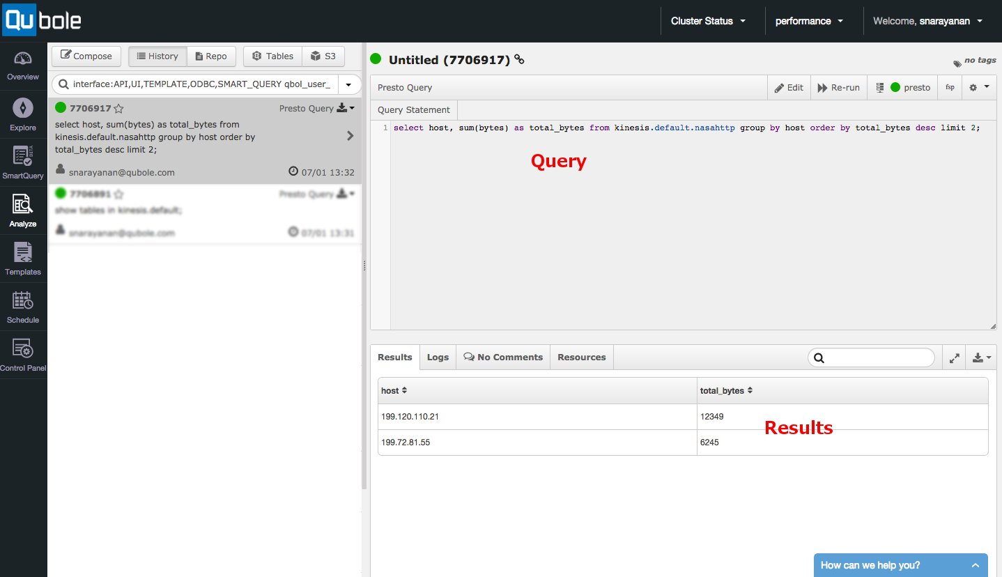 - Go back to the Analyze page and compose a Presto command against this table. The screenshot below shows different components of the Analyze page. The first Presto query will launch the cluster, which may take ~2 minutes. You will see logs with progress information while the query is executing and results when the query is done. The query in this example finds hosts that have requested maximum bytes from the HTTP server.