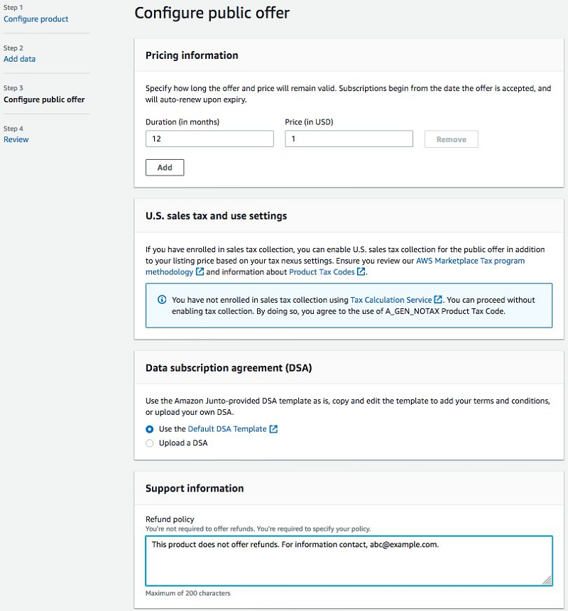 - Choose Next to proceed to the Configure the public offer page. This is the page where you configure the offer details for your product, including the available pricing options, the Data Subscription Agreement, and the refund policy.You can also choose whether you would like to enable subscription verification. If you enable subscription verification, prospective subscribers will have to fill in information such as their name, company name, email address, and use-case before being able to subscribe. The subscription request will then appear on your Product Dashboard page, and you will have up to 45 days to approve or decline the request. For information about subscription verification, see Subscription Verification for Providers.